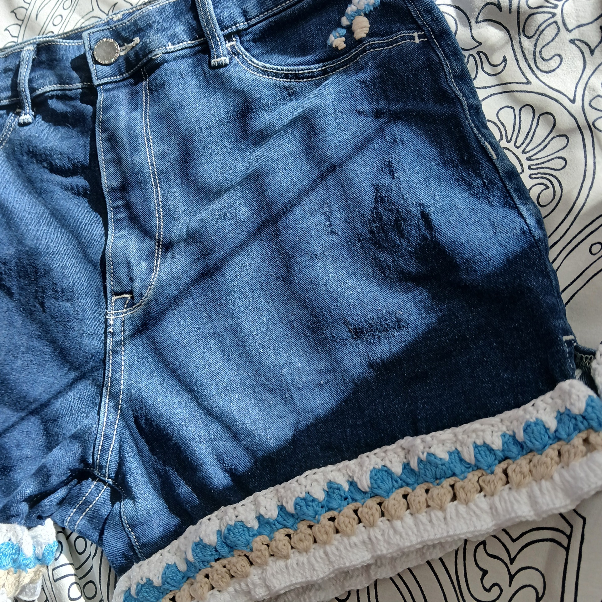 Háčkováná obruba, pár malých výšivek. Slušivé, jemné a trendy. Modré barvy se skvěle doplňují, bílá je kontrastní a béžová skvělým společníkem těchto barev.